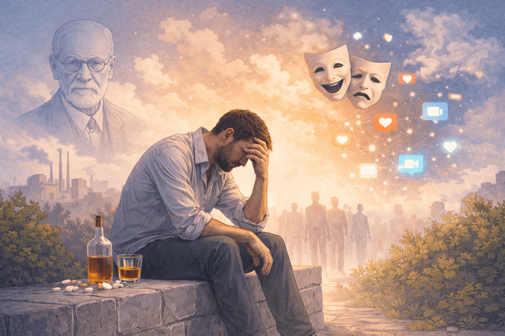 Freud também aponta que, diante desse sofrimento, o sujeito busca formas de alívio. Entre elas, o uso de substâncias psicoativas ocupa um lugar central por oferecer uma modificação artificial do estado psíquico, produzindo prazer imediato ou afastamento temporário da realidade. Esse recurso, embora eficaz a curto prazo, não resolve o conflito subjacente e tende a aprofundar o sofrimento ao longo do tempo.
